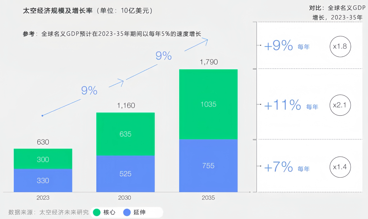 世界经济论坛和麦肯锡公司联合发布的报告指出,2035年全球太空经济总值将达到1.8万亿美元,相比2023年的6300亿美元,年平均增长率高达9%,成为未来十年拉动经济增长的重要引擎。