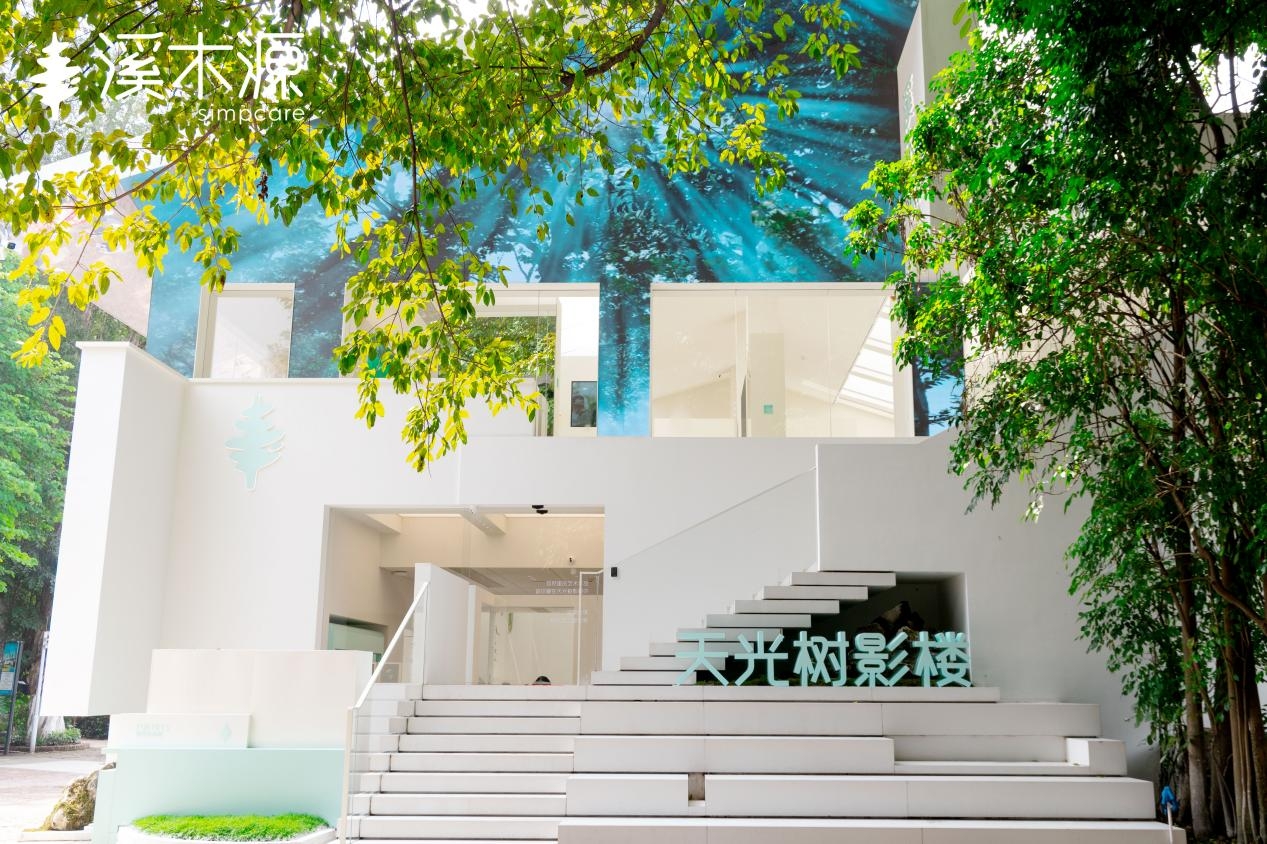 和很多品牌位于商超和街边闹市的旗舰店不同,溪木源的旗舰店位于集自然、创意、艺术、文化于一体的创意园区内,门店的主体建筑还有一个雅致的名字——“天光树影楼”,大楼白色墙体在品牌的VI色天青色的点缀下,自然又雅致。门头上方的LED动态屏幕与镜面不锈钢交相辉映,空间仿佛无限延伸,引领参观者步入一个充满未来感的世界。
