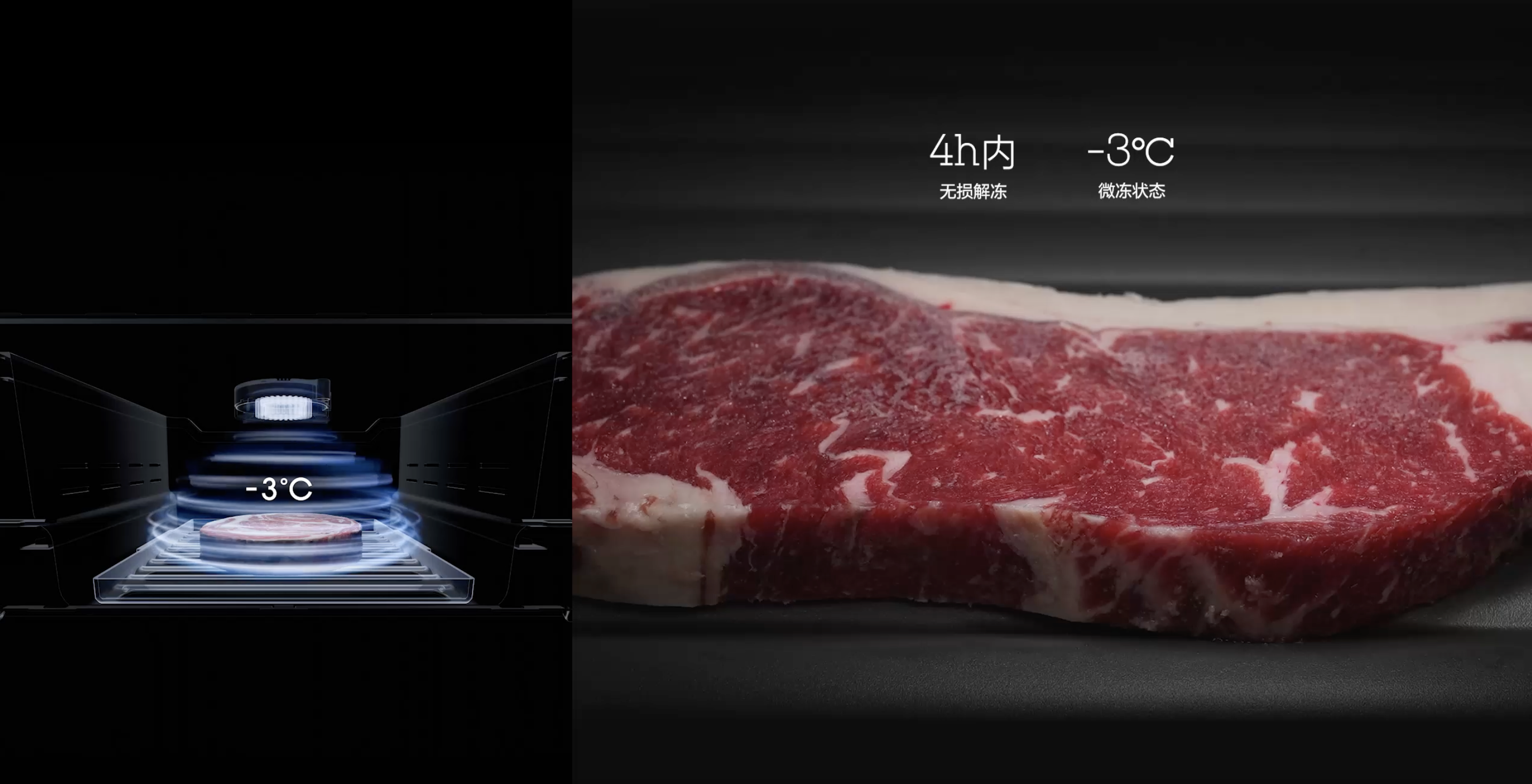 还有化解冻技术。方太为肉类化冻设计了独立的空间、加了金属导热板和加快空气流动的技术,既避免肉类被其他区域的食材或物品污染滋生细菌,又能加快解冻速度、解冻也更均匀。而且,方太定义的理想的化冻温度是化到-3度——这个温度的肉,还有点硬,切起来更方便,也不会在解冻和切割的过程中因为血水流出导致肉类的肌红蛋白等营养物质流失。