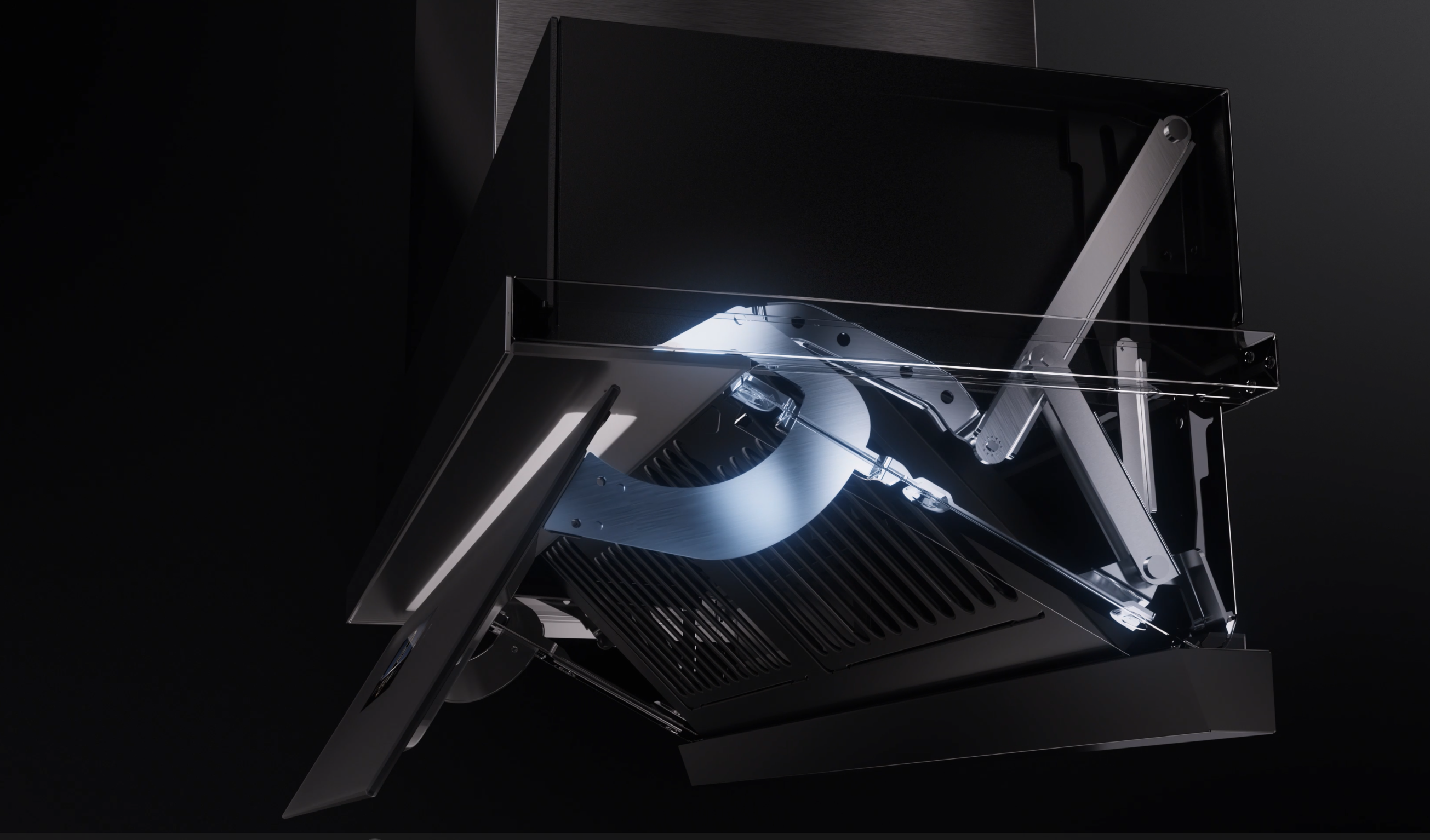 Y8以独创的航空级折叠升降运动结构,将油烟机机体巧妙地隐进吊柜之中,炉火打开,烟机将如蝴蝶般徐徐展开翅膀,开始工作,烹饪结束,双翼将被收起,回隐于无形之中。
