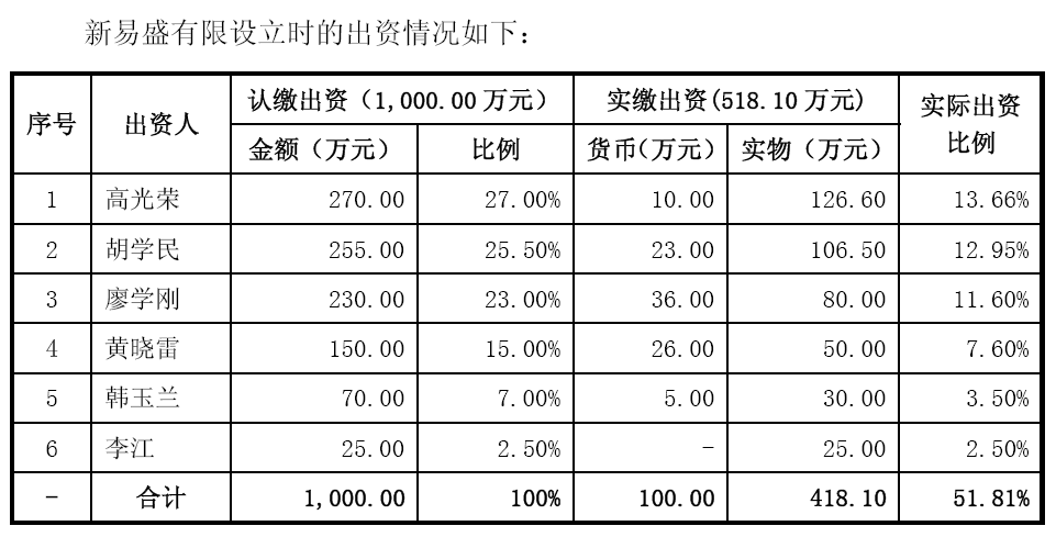 但过程中,高光荣却通过认缴出资270万(实缴10万元+实物126万),一举拿下27%的股权,成了“新易盛”董事长、第一大股东。