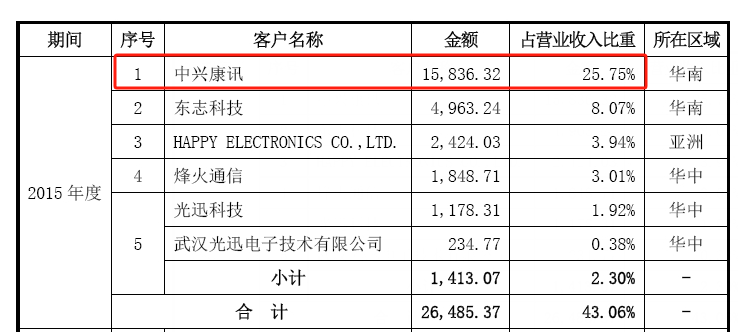 2015年,仅中兴通讯一家从新易盛就采购了1.58亿,贡献了总营收的四分之一。