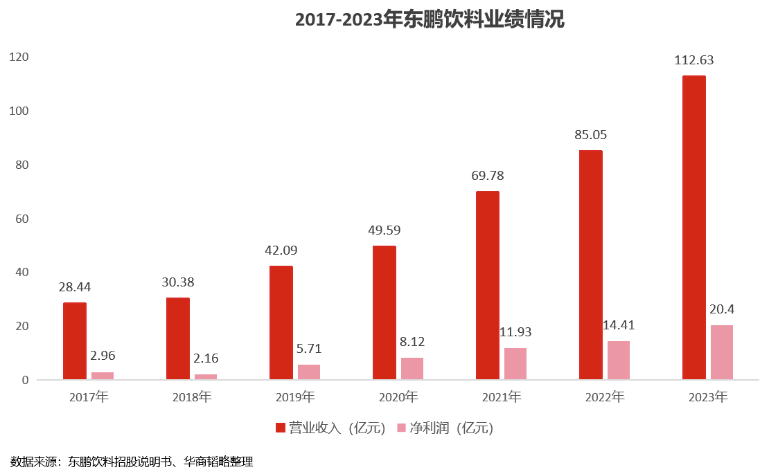 2023年,东鹏饮料销售额达112.63亿,净利润20.4亿,是全国化刚开始时的十倍。
