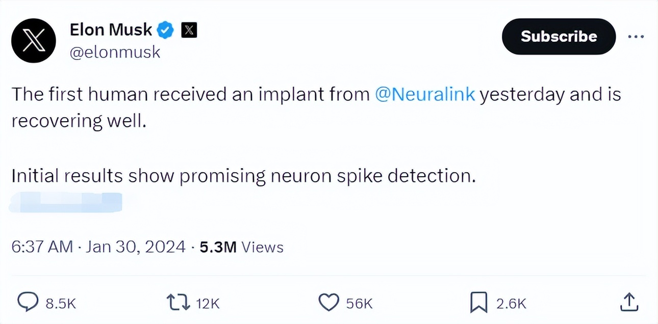 “昨天,第一位人类患者接受了来自神经连接的植入手术,目前恢复良好。初步结果显示,神经元尖峰检测很有前景。”