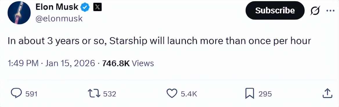 大约三年后,星舰每小时会发射超过一次!