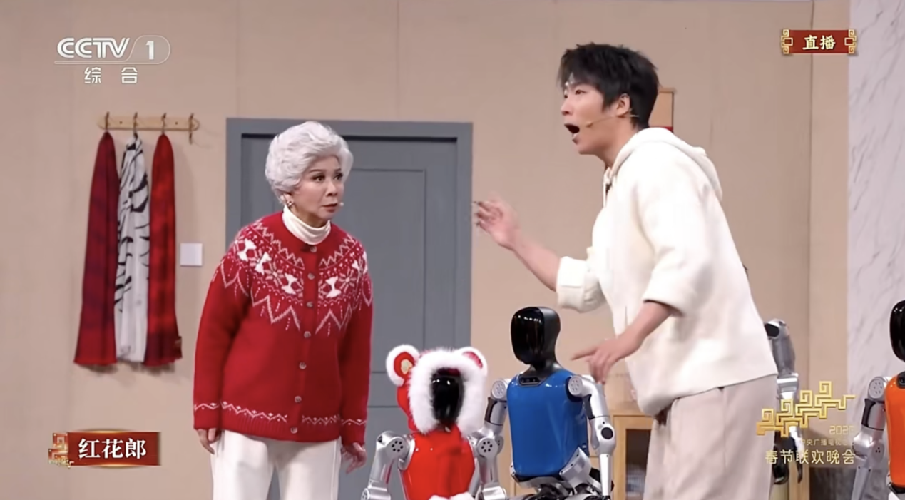 机器人翻腾跳跃,歌舞流光溢彩。而在这些热闹背后,一抹“中国红”贯穿始终——从角标到节目,从公益片到零点祝福,红花郎的身影出现在多个关键时刻。