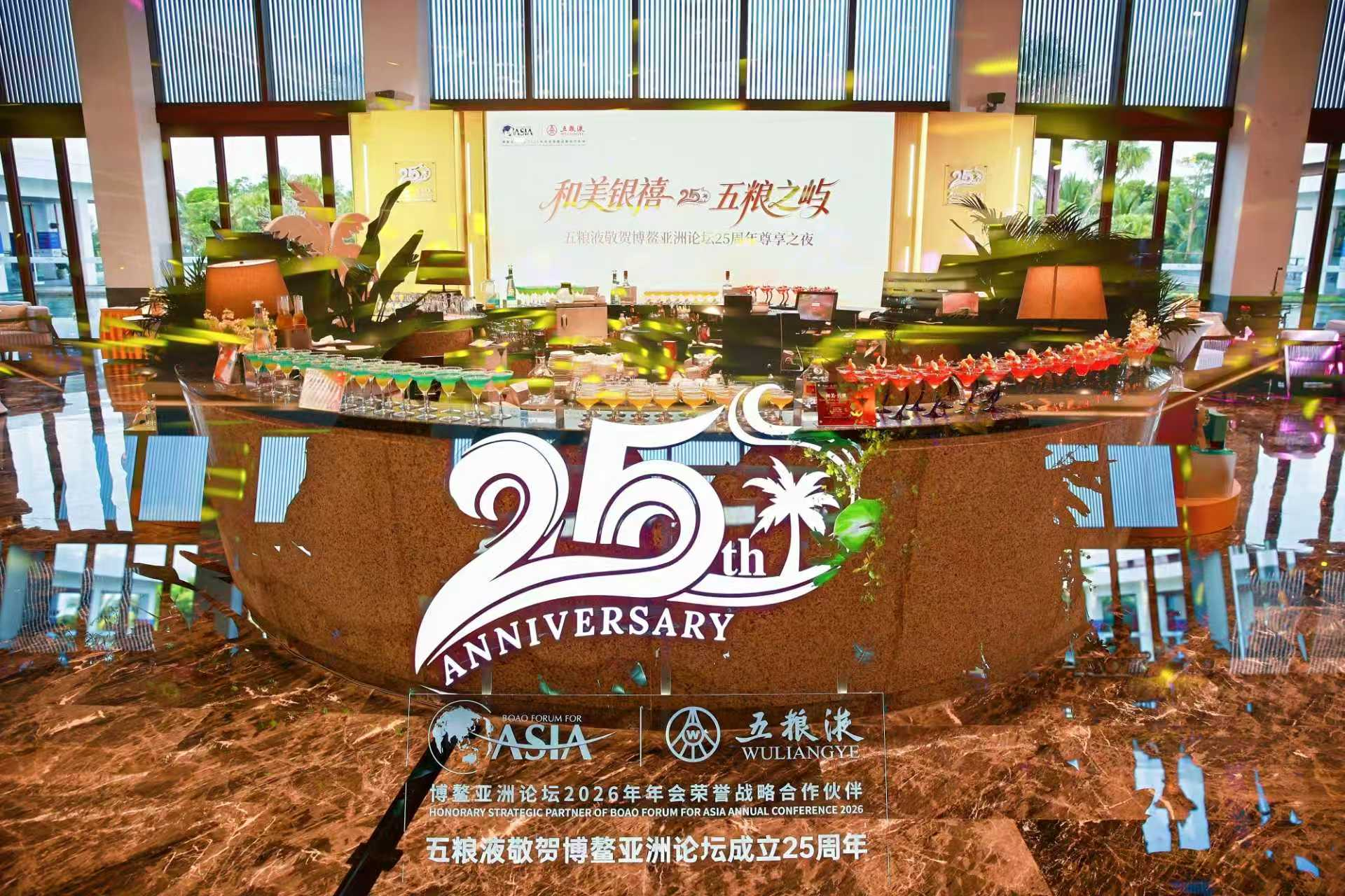 3月26日晚,作为博鳌25周年的重要配套活动,“和美银禧 五粮之屿——五粮液敬贺博鳌亚洲论坛25周年尊享之夜”璀璨举行。现场以沉浸式品鉴为核心,精选29度五粮液·一见倾心、39度五粮液、第八代五粮液为基酒,匠心打造“和美·礼赞”“和美·韶华”“和美·共潮”特调鸡尾酒,通过29度的轻盈、39度的醇厚、52度的经典三段式风味叙事,将论坛25年风雨兼程与五粮液的多粮酿造哲学巧妙勾连,演绎了从“礼赞过去”到“共赴未来”的情感升华。
