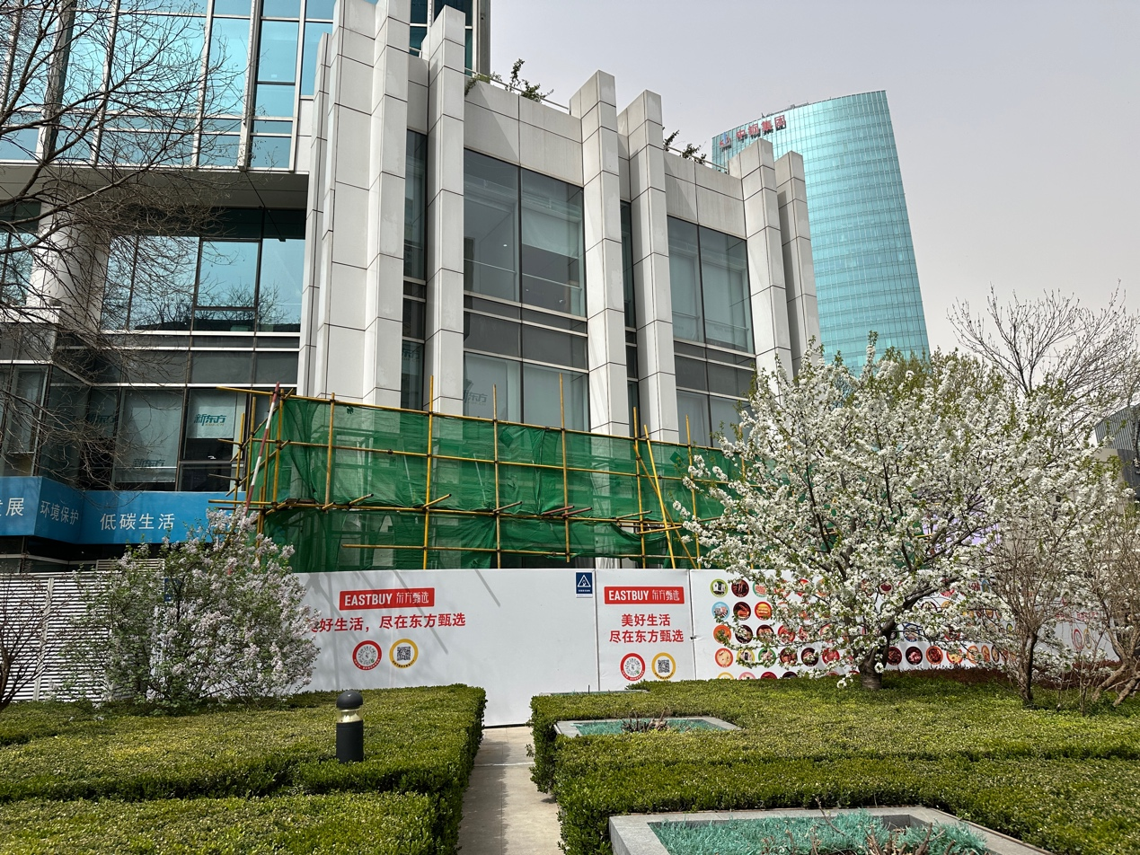 4月3日中午,华商韬略在中关村现场观察到,新东方南楼底商已经被标着“东方甄选”字样的白板围起,内部施工区域覆有绿色防护网,装修工作显然尚未完成。