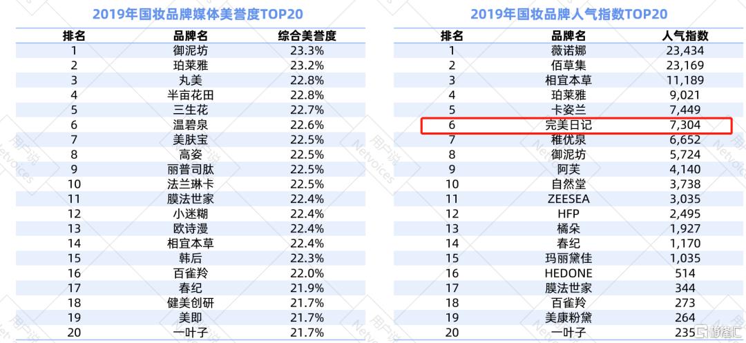 作为一个知名度品牌,完美日记霸榜2019国妆品牌声量指数、品牌互动指数榜单,数据遥遥领先,然而放眼品牌美誉榜单top20,完全不见其身影,人气指数榜单也只排在第6位。