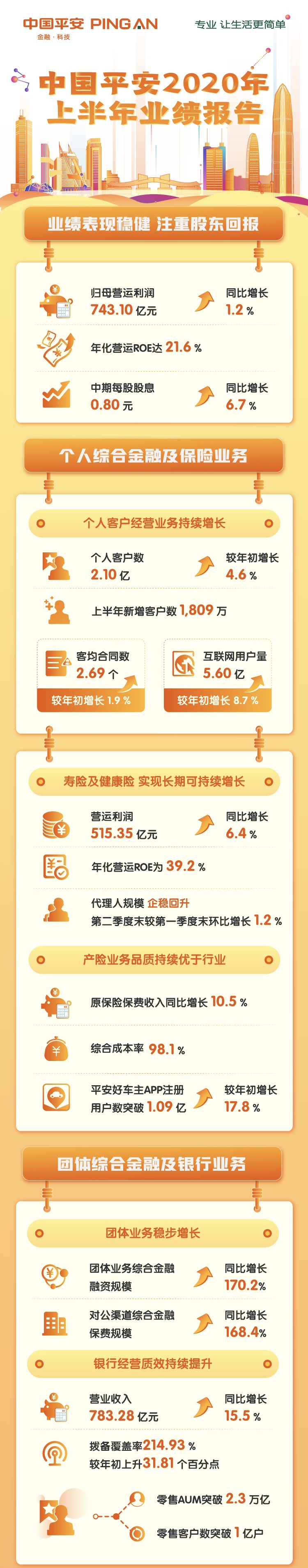2020年8月27日,中国平安保险(集团)股份有限公司(以下简称“中国平安”、“平安”、“集团”或“公司”,股份代码:香港联合交易所2318,上海证券交易所601318)今日公布截至2020年6月30日止中期业绩。