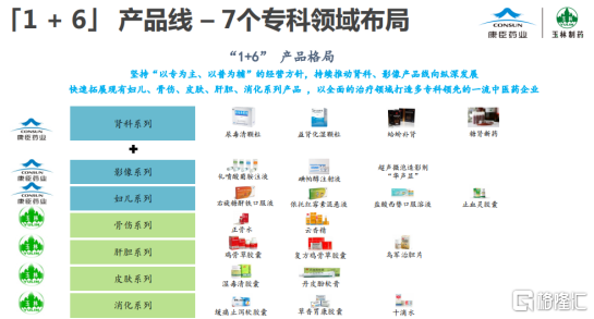 康臣药业主打产品管线为“1+6”产品线,坚持“以专为主、以普为辅”的经营方针,持续推动肾科、影像产品线向纵深发展,并且快速拓展现有妇儿、骨伤、皮肤、肝胆、消化系列产品。