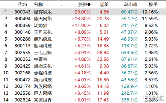 游戏概念股走强,迅游科技、星辉娱乐冲击涨停,盛天网络、汤姆猫涨超10%,凯撒文化、三七互娱、完美世界等纷纷走强。