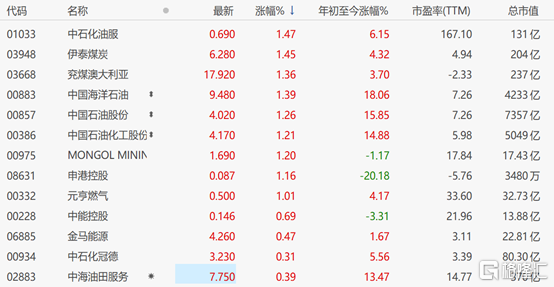 港股“三桶油”走高,中国石油股份涨1.26%,中国石油化工涨1.21%,中国海洋石油涨1.39%。