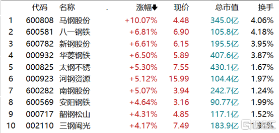 钢铁股拉升,马钢股份涨停,八一钢铁、华菱钢铁、新钢股份、太钢不锈等冲高。