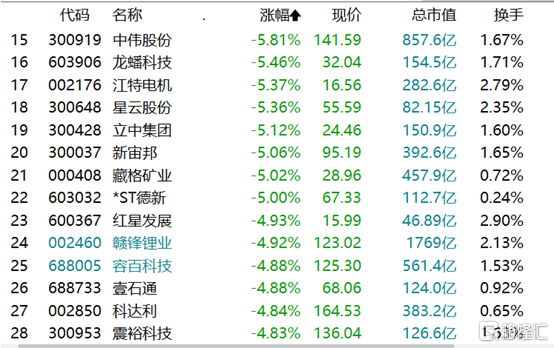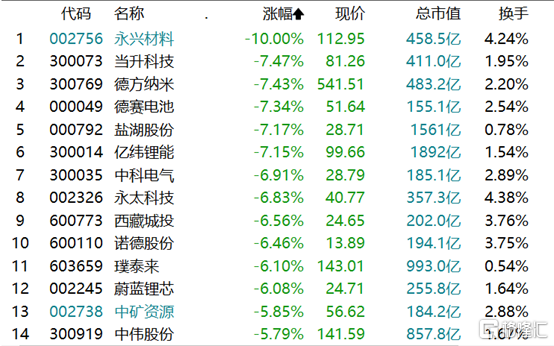 包括天赐材料、永兴材料等,业绩出来就遭暴击,天赐跌破千亿市值,而永兴今天更是跌停。