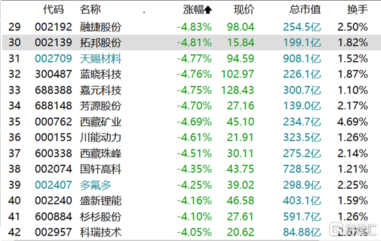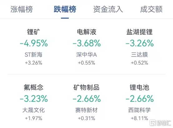 今日锂电板块绿的发慌,宁德时代、比亚迪大跌近4%,锂矿跌4.91%,永兴材料跌停,亿纬锂能、盐湖股份、天齐、赣锋等均跌超5%。电解液跌3.71%,天赐材料继续大跌近5%。盐湖提锂跌3.25%,氟概念跌3.23%。