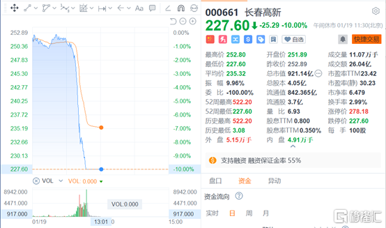 长春高新盘中突发跌停,成交额达到26亿,市值直接损失百亿。