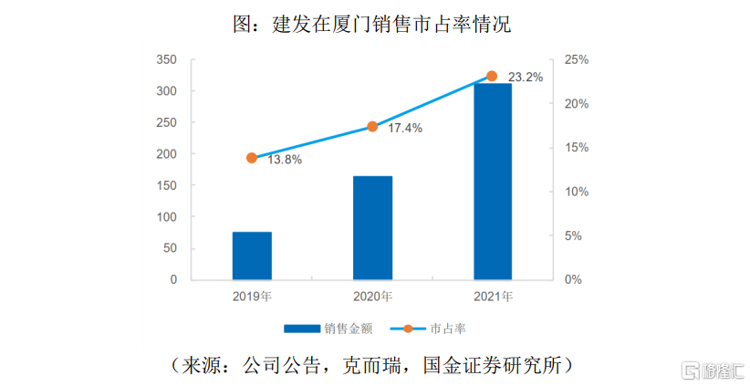 根据国金证券的统计数据显示,自2019年起,建发房产始终位于厦门销售榜第一,且市占率持续提升,从2019年的13.8%提升至2021年的23.2%。据此可推断,建发物业在母公司重点深耕的厦门,乃至福建省亦具备较高的管理密度。