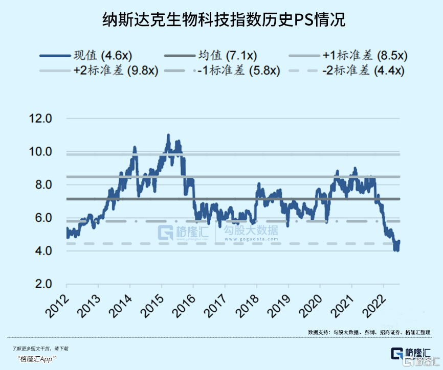 在受到美联储缩表和加息影响,避险情绪持续发酵,交易活跃度下降,美股生物科技类企业表现较差。根据彭博数据显示,全球生物科技股票接近超卖状态,包括标普和纳斯达克生物科技指数较一年前的峰值下跌约50%和30%,如下表所示,纳斯达克生物科技指数市销率为4.6倍(较历史十年平均值7.1倍低2个标准差),目前估值已经进入底部区间。