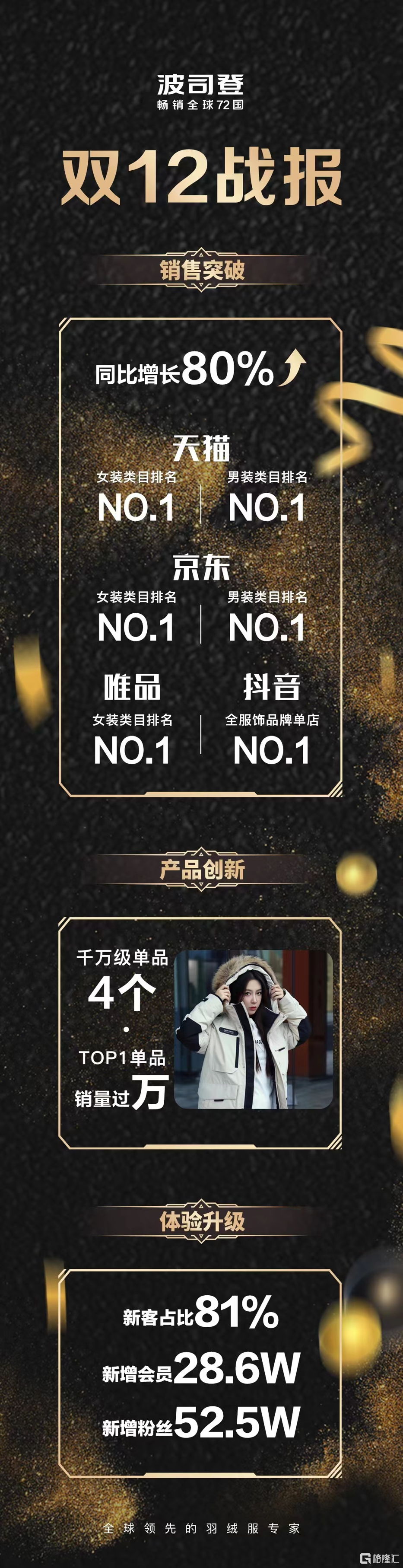 数据显示,双十二期间,波司登销售额同比实现80%的增长,公司继续霸榜各大平台,位居位居天猫和京东女装类目排名和男装类目排名首位、位居唯品会女装类目排名首位以及抖音全服饰品牌单店第一名。产品方面来看,期间实现销售额千万级单品达4个,最大单品销量更是过万。此外,此次双十二期间,平台新客占比81%,新增会员28.6万,新增粉丝52.5万。