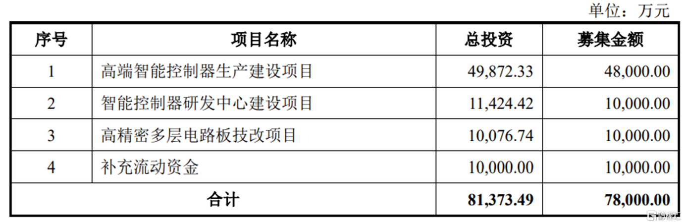 本次IPO拟募集的资金主要用于高端智能控制器生产建设项目、智能控制器研发中心建设项目、高精密多层电路板技改项目、补充流动资金。