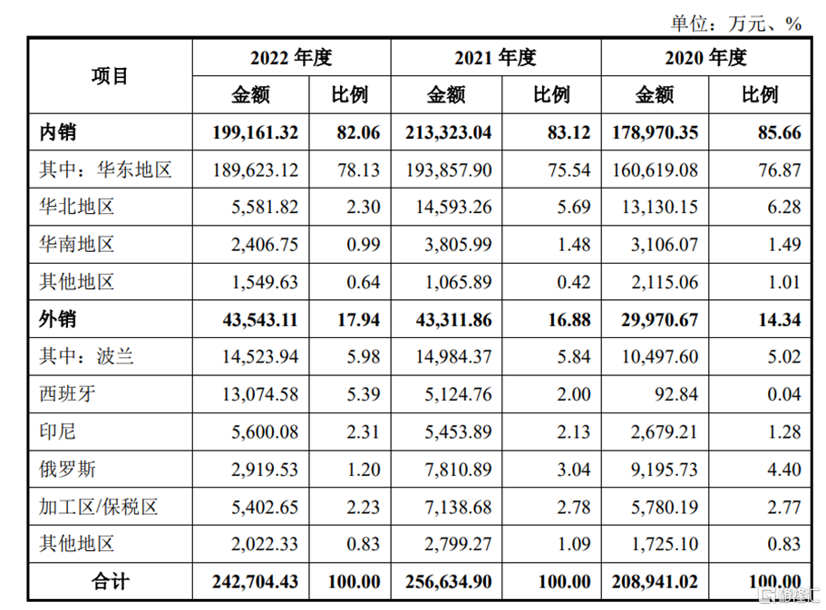 报告期内,公司以境内销售为主,其境内销售主要集中于华东地区,该地区也是国内家居产品制造的重要生产基地。 同时,公司境外销售金额整体呈现良好增长的趋势。境外销售主要集中在波兰、西班牙、印尼及俄罗斯等区域。