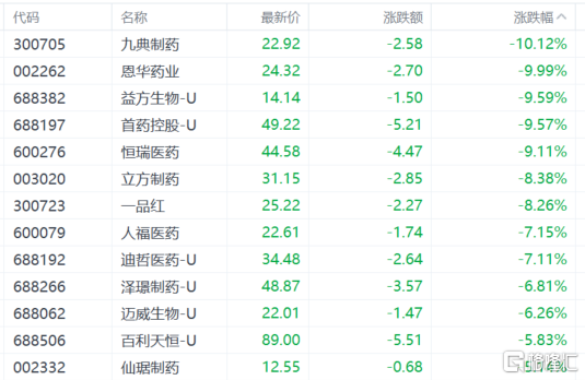 今日,化学制药、生物制品、医药器械、医药商业、中药等板块全线下挫,多只医药股集体大跌。截止收盘,九典制药跌超10%,恩华药业跌停,一品红、人福医药、智飞生物等纷纷跟跌。
