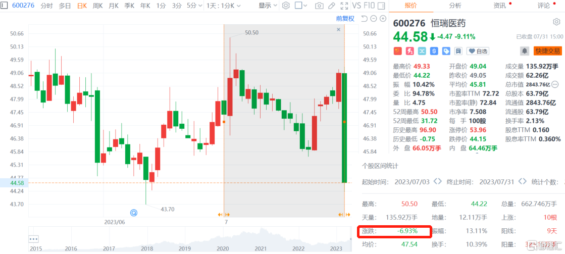 其中,医药股“龙头”恒瑞医药逼近跌停,收跌9.11%报44.58元,总市值2843.76亿元。整个7月,该股累计跌幅近7%。对于今日的大跌,恒瑞医药方面回应表示:“股价波动受多种因素影响,公司经营正常。”