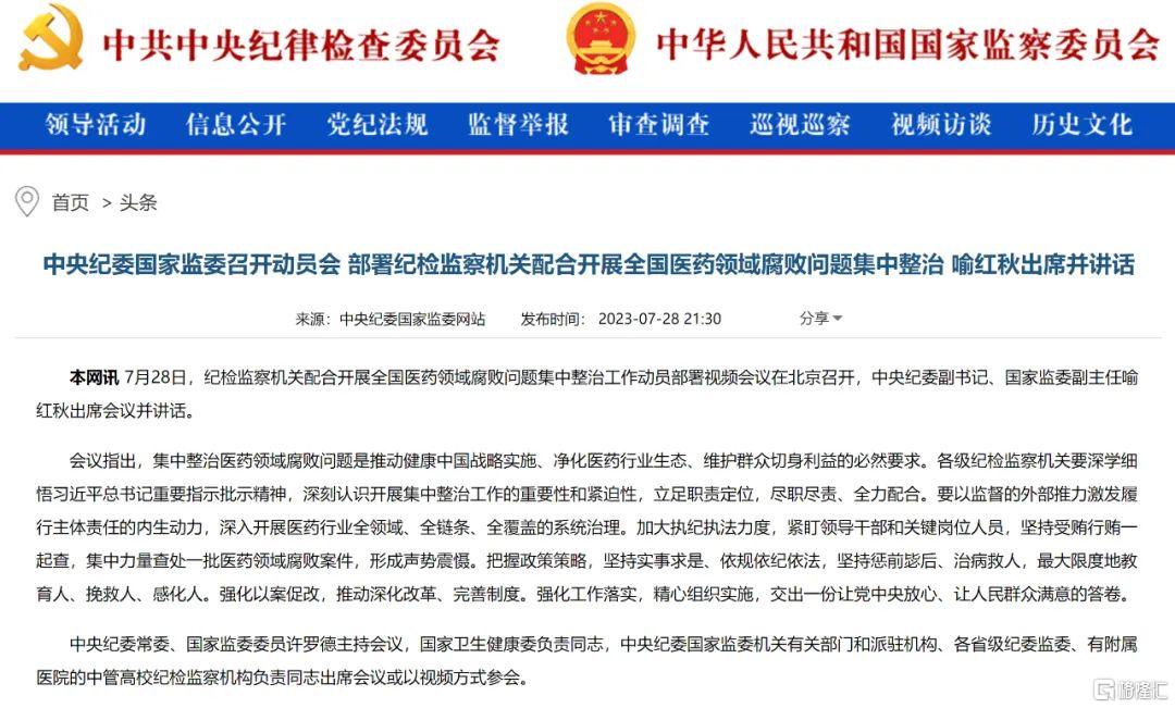 据中央纪委国家监委网站消息,7月28日,纪检监察机关配合开展全国医药领域腐败问题集中整治工作动员部署视频会议在北京召开。