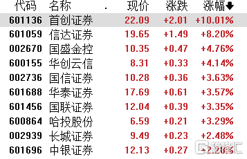 截止发稿,首创证券涨停,信达证券涨超8%,国盛金控、国信证券、华泰证券、长城证券、中银证券等纷纷上涨。
