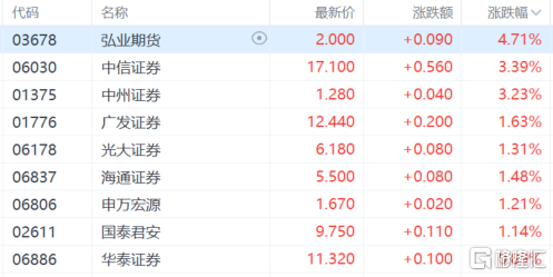 港股中资券商股同样表现活跃。截止发稿,中信证券涨超3%,华泰证券、广发证券、海通证券、光大证券等跟涨。
