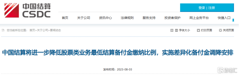 8月3日,中国结算官网发布《中国结算将进一步降低股票类业务最低结算备付金缴纳比例,实施差异化备付金调降安排》文章,其中提到,拟自2023年10月起进一步降低股票类业务最低结算备付金缴纳比例,将该比例由现行的16%调降至平均接近13%,并正式实施股票类业务最低结算备付金缴纳比例差异化安排。