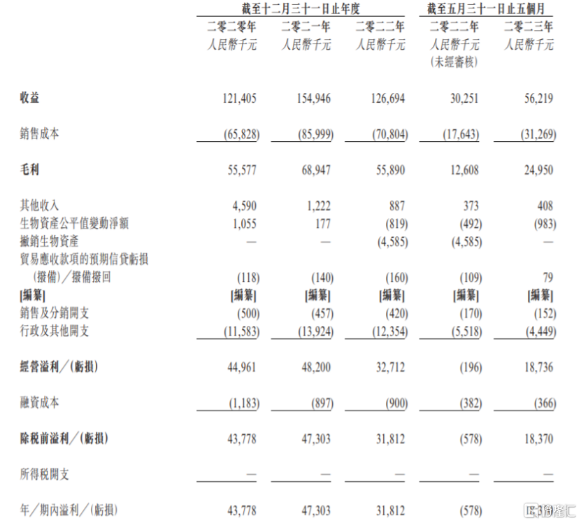业绩方面,招股书显示,2020年至2023年前五个月,富景农业的收益分别约1.21亿元、1.55亿元、1.27亿元和0.56亿元,对应的期内溢利分别为4377.8万元、4730.3万元、3181.2万元和1837万元,其中2022年公司的收益及期内溢利双双下滑。