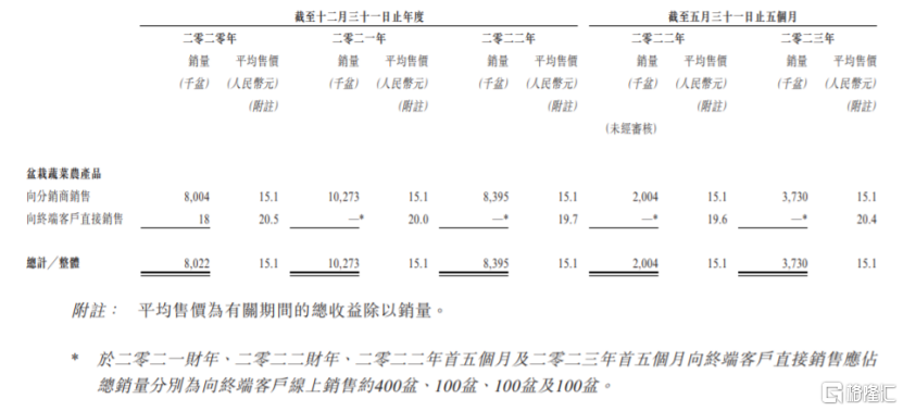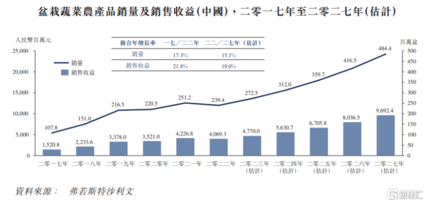 据弗若斯特沙利文数据,2017年至2022年,盆栽蔬菜农产品的销售收益由约15.2亿元增长至40.69亿元,复合年增长率约为21.8%。按蔬菜净重计算的销量来看,2022年中国盆栽蔬菜农产品的总销量占蔬菜农产品总销量的比重低于0.1%。