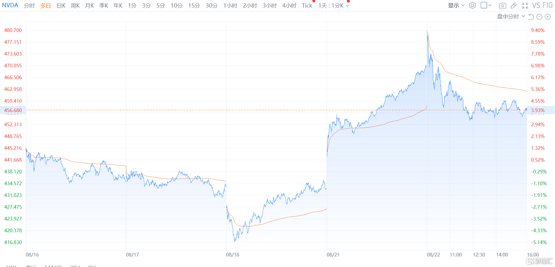 隔夜,英伟达股价开盘走高,攀升2.6%,一度创下481.87美元的盘中历史新高,随后下跌,收盘时跌2.8%。