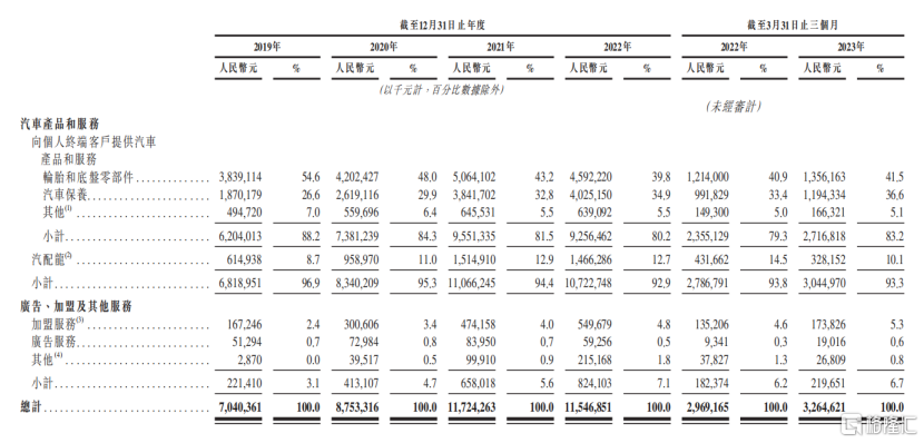 途虎养车2011年成立于上海,是一家线上线下一体化汽车服务平台,为车主们提供汽车产品和服务,包括给汽车更换轮胎和底盘零部件、汽车美容、自动化汽车清洁及维修等,同时公司也向品牌商提供加盟服务及广告服务。从营收结构来看,报告期内,公司的汽车产品和服务业务营收占比在90%以上。