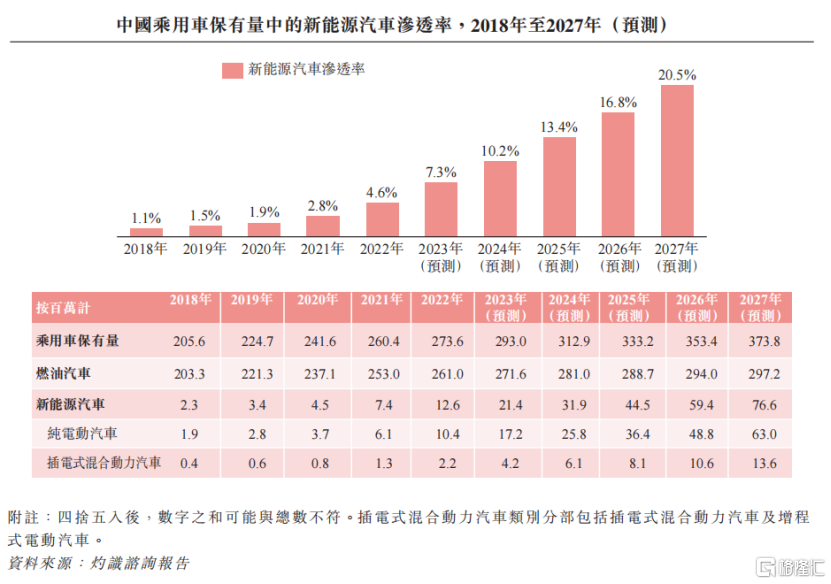 近年来,新能源汽车渗透率和保有量均呈上升趋势。2022年我国新能源汽车的年销量为650万辆,新能源乘用车保有量达到1260万辆,但中国的新能源乘用车保有量在乘用车总保有量中的占比为4.6%,据灼识咨询报告,到2027年预计占比将提升至20.5%。