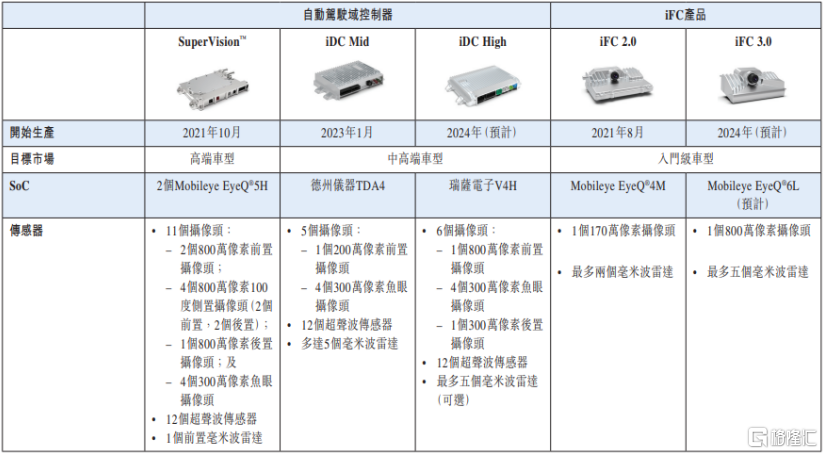 目前,该公司拥有两条产品线,即与Mobileye合作开发的SuperVision™(首次应用于极氪001)及自主设计的iDC系列,包括iDC Mid及iDC High。此外,知行科技还提供智能前视摄像头(iFC)产品,且解决方案及产品覆盖广泛的车辆价格段及全驾驶场景,包括高速公路、环路、复杂道路、乡村道路及停车场。