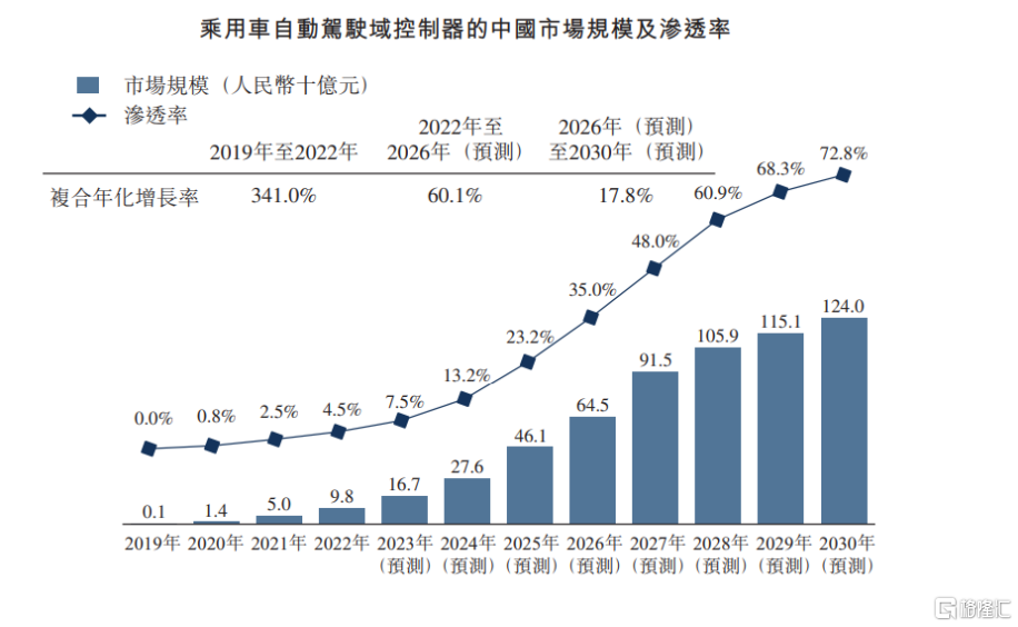 根据公司招股书显示,2019-2022年,中国的自驾域控市场规模从1亿元(人民币,单位下同)增长到98亿元,年均复合增速达341.0%;预计2026年将达到645亿元,2028年有望站上千亿台阶。