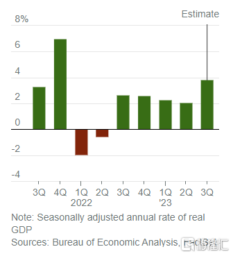 FactSet的普遍预期显示,经济学家预测第三季度美国实际国内生产总值的年增长率为3.8%。如果准确的话,这将是自2021年末以来增长最快的一个季度,并且比第二季度修正后的2.1%的增长速度大幅加快。