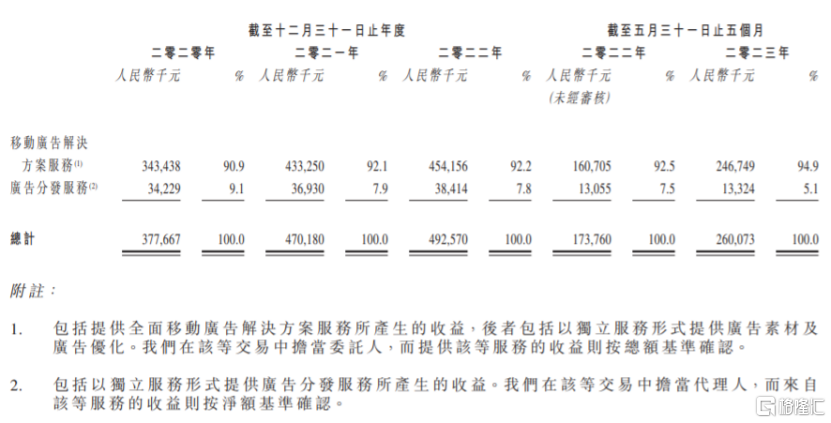 按服务类别划分,2020年、2021年、2022年及2023年1-5月,乐思集团来自移动广告解决方案服务的收益占总收益的90%以上,而广告分发服务的营收占比相对较小。