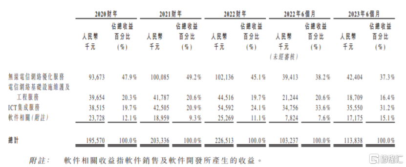 于往绩记录期间,公司提供电信网络支援服务,包括无线电信网络优化服务、电信网络基础设施维护及工程服务;ICT集成服务;及电信网络相关软件开发服务。其中,无线电信网络优化服务的收入占比较大。