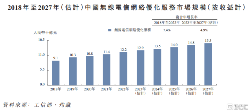 随着电信网络用户对优质移动网络质量需求的增加,电信营运商在提升电信网络速度及稳定性方面投入巨资。2018年至2022年,我国无线电信网络优化服务市场规模从91亿元增长至122亿元,复合年增长率为7.4%。预计到2027年,按收益计,其市场规模将进一步扩大至155亿元,2022年至2027年的复合年增长率为4.9%。