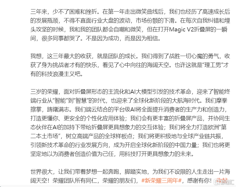 这三年最大的收获,就是团队的成长,公司实现中国智能手机市场与折叠屏市场的双登顶,海外市场增速超过200%,并在两年内实现了盈利性增长。