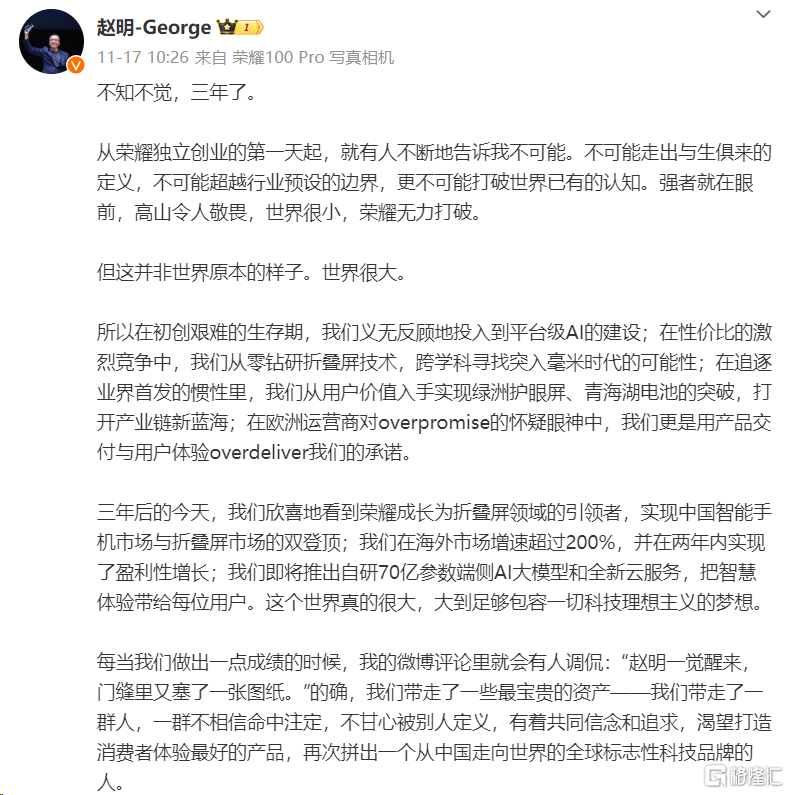 今年的11月17日,是荣耀独立华为体系以来的第三周年。