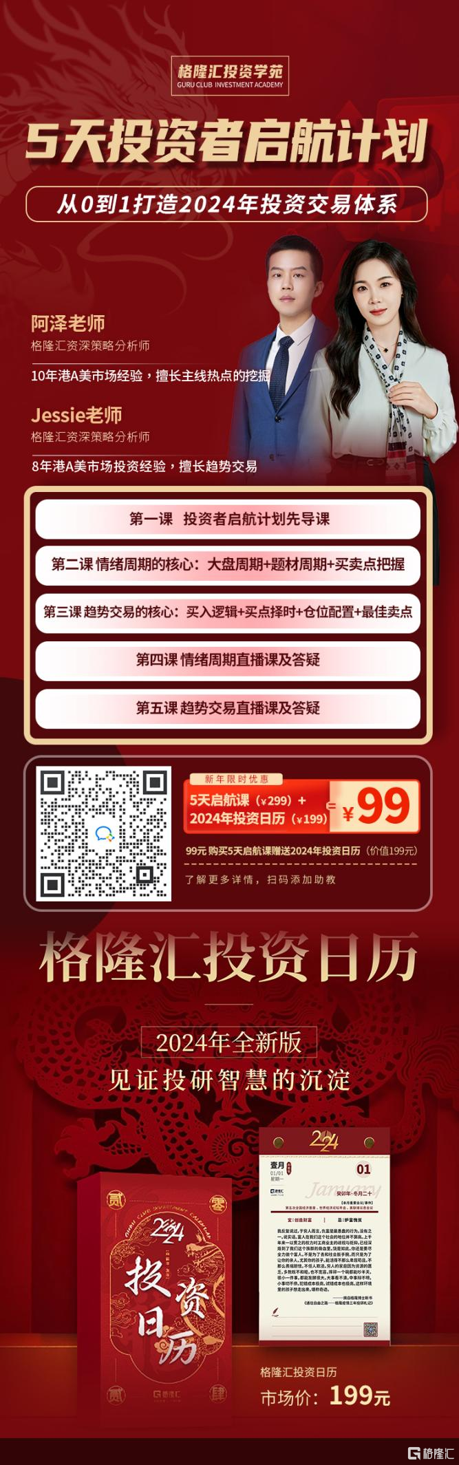 此五大课程原价299元,新年限时特惠价只需99元,同时还给大家特别赠送原价199元的2024年全新版《格隆汇投资日历》一份!