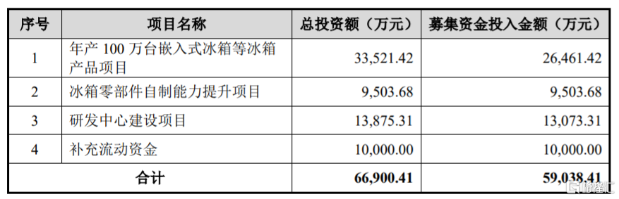 本次IPO所募集的资金主要用于年产100万台嵌入式冰箱等冰箱产品项目、冰箱零部件自制能力提升项目、研发中心建设项目、补充流动资金。