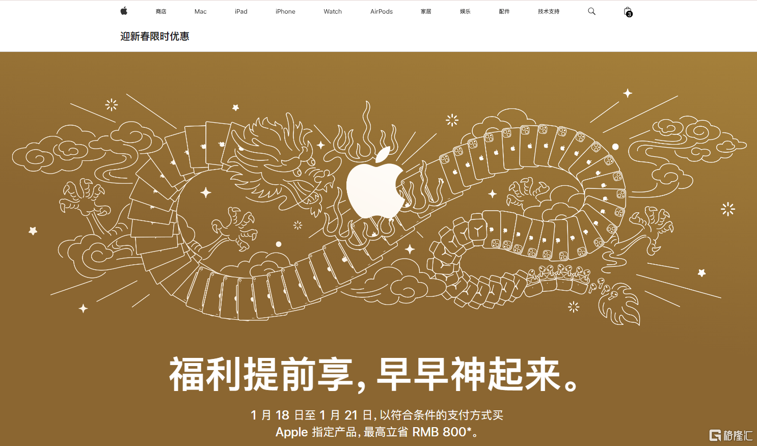 今日,苹果官网首页上线了活动预告,将于1月18日-21日开启“迎新春限时优惠”,以符合条件的支付方式购买Apple指定产品,最高立省800元。