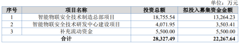本次申请上市,公司拟募集资金用于智能物联安全技术制造总部项目、智能物联安全技术研发中心建设项目、补充流动资金。