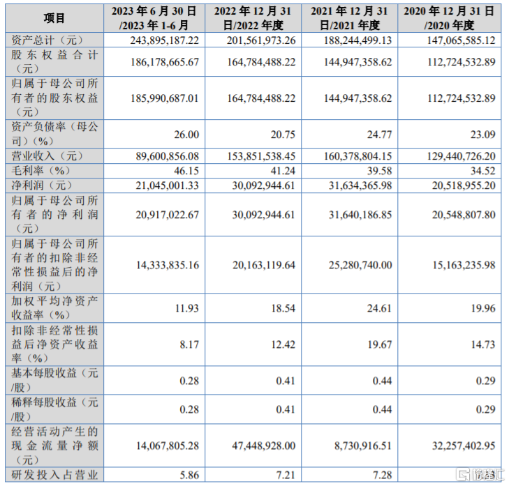 业绩方面,2020年至2023年上半年,纬诚科技分别实现营收约1.29亿元、1.6亿元、1.54亿元、0.9亿元,实现净利润约2051.9万元、3163.44万元、3009.29万元、2104.5万元,公司业绩存在一定波动。